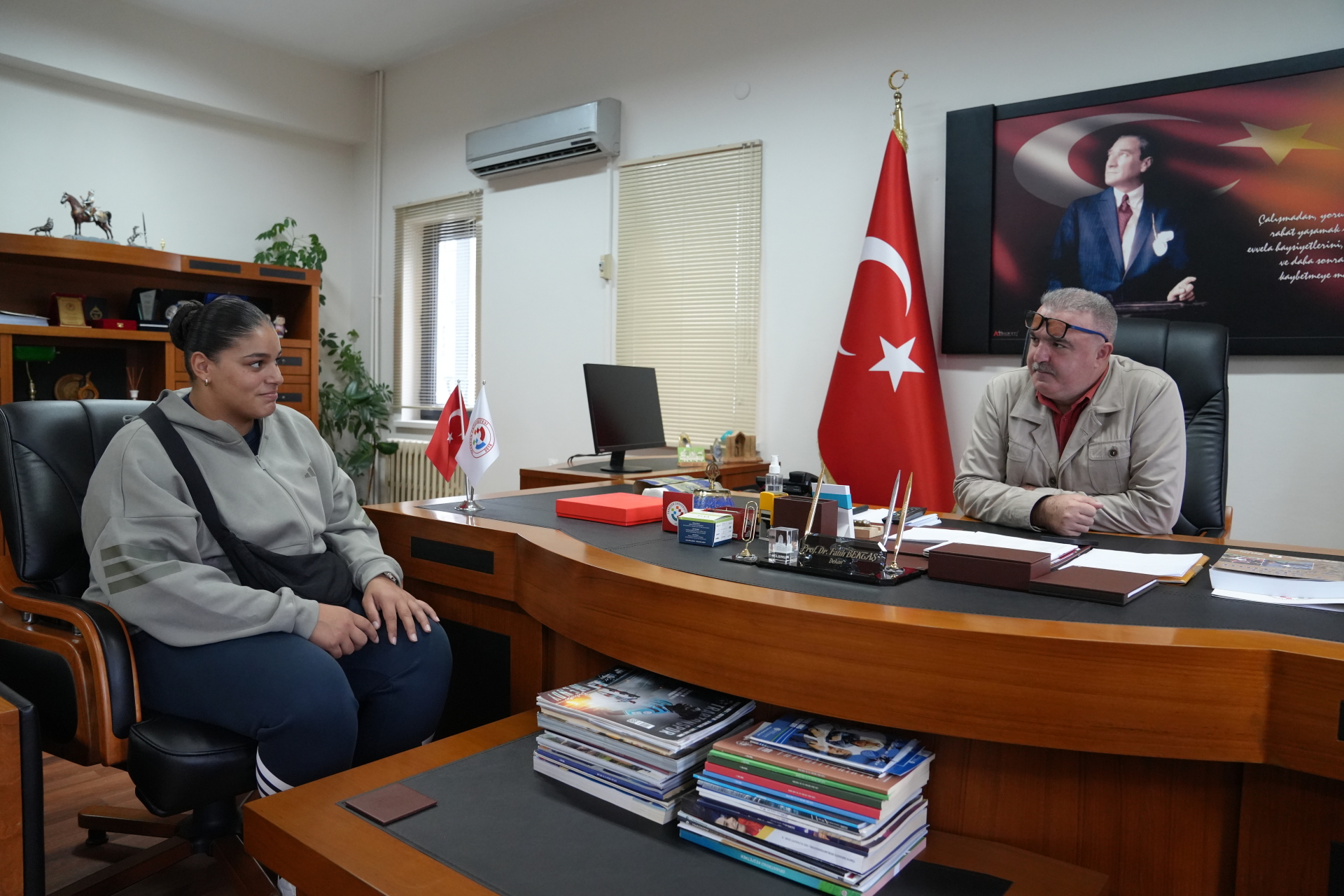 Spor Bilimleri Fakültesi olarak akademik, sosyal ve lojistik olarak her zaman Havvanur’un yanında olacaklarını söyleyen Dekanımız Prof. Dr. Fatih Bektaş öğrencimizi kutlayıp başarılarının devamını dilerken, Havvanur da Dekanımıza hem sporda hem derslerde başarılı olma sözü verdi ve desteklerinden dolayı teşekkürlerini bildirdi.