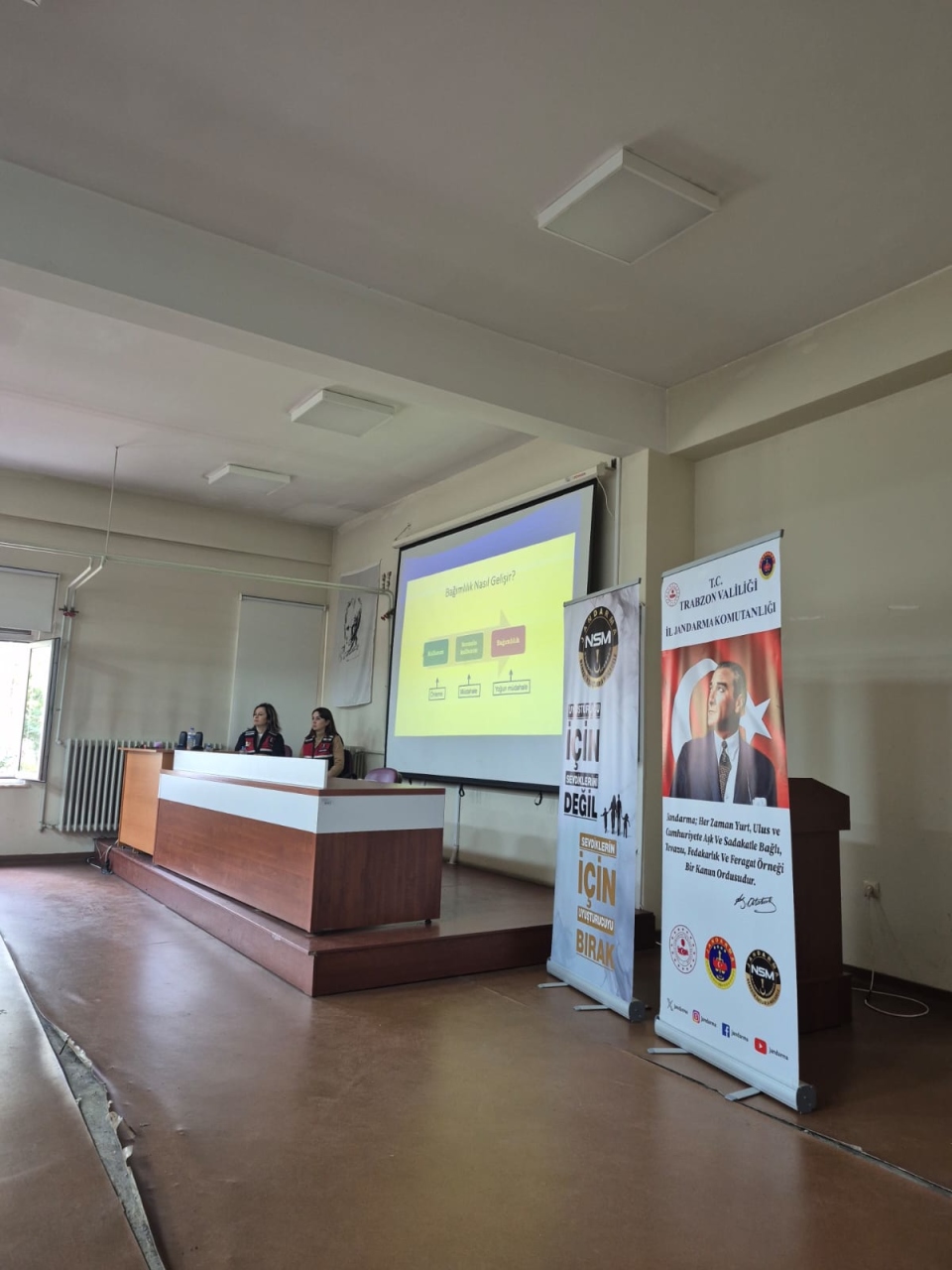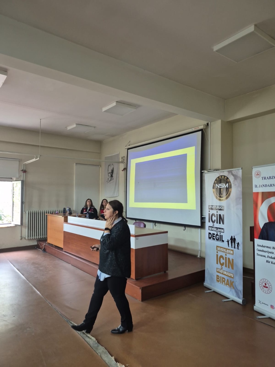 İl Jandarma Komutanlığının işbirliğiyle, Trabzon Üniversitesi Bağımlılıkla Mücadele Koordinatörlüğünden Dr. Öğr. Üyesi Fatma Dilek ŞEKER tarafından 'Bağımlılıkla Mücadele' konulu konferansı gerçekleşmiştir. Kendilerine değerli sunumları için teşekkürlerimizi iletiriz.